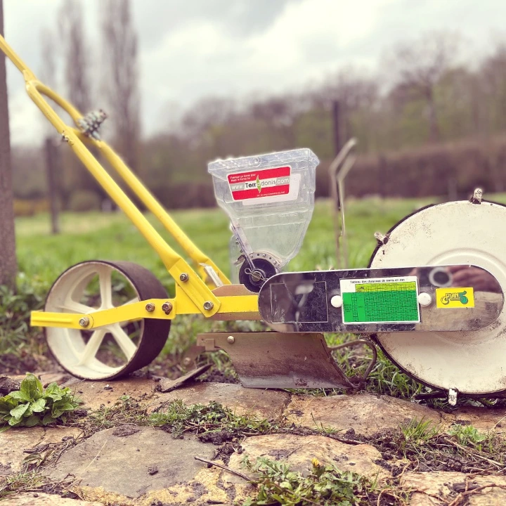 Nous cherchons à semer dans un sol parfaitement propre, finement préparé. Le lit de semence doit être irréprochable. Pour le semis, nous utilisons un semoir Jang JP1, un outil de référence en maraîchage. Précis, fiable, relativement simple à régler, il permet d’obtenir une densité régulière.