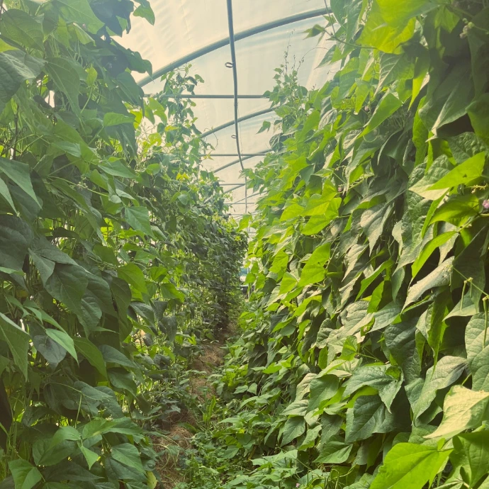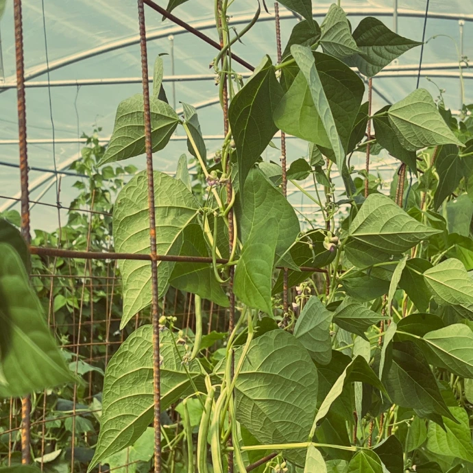 – Pour les cultures hautes (concombres et haricots): on suspend ces grands treillis à nos barres de cultures de serres, ce qui ne prend que quelques minutes. Ils sont par ailleurs enfoncés dans le sol sur quelques centimètres. On utilise quelques bouts de fils de fer pour les attacher les uns aux autres, et c’est parti ! Le résultat est spectaculaire (voir les photos), je n’ai jamais cultivé des haricots en aussi belle forme, ils font 3 mètres de haut!